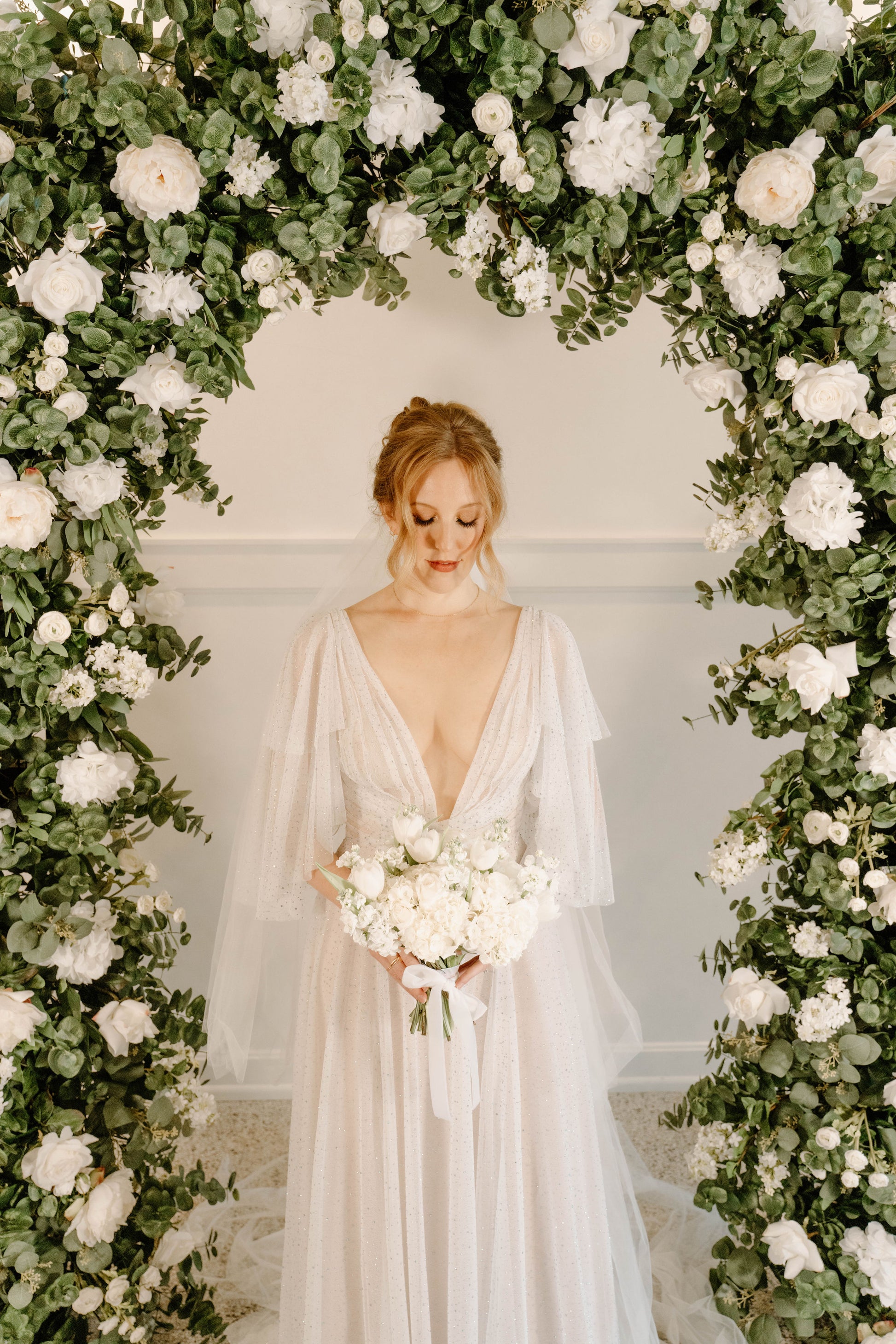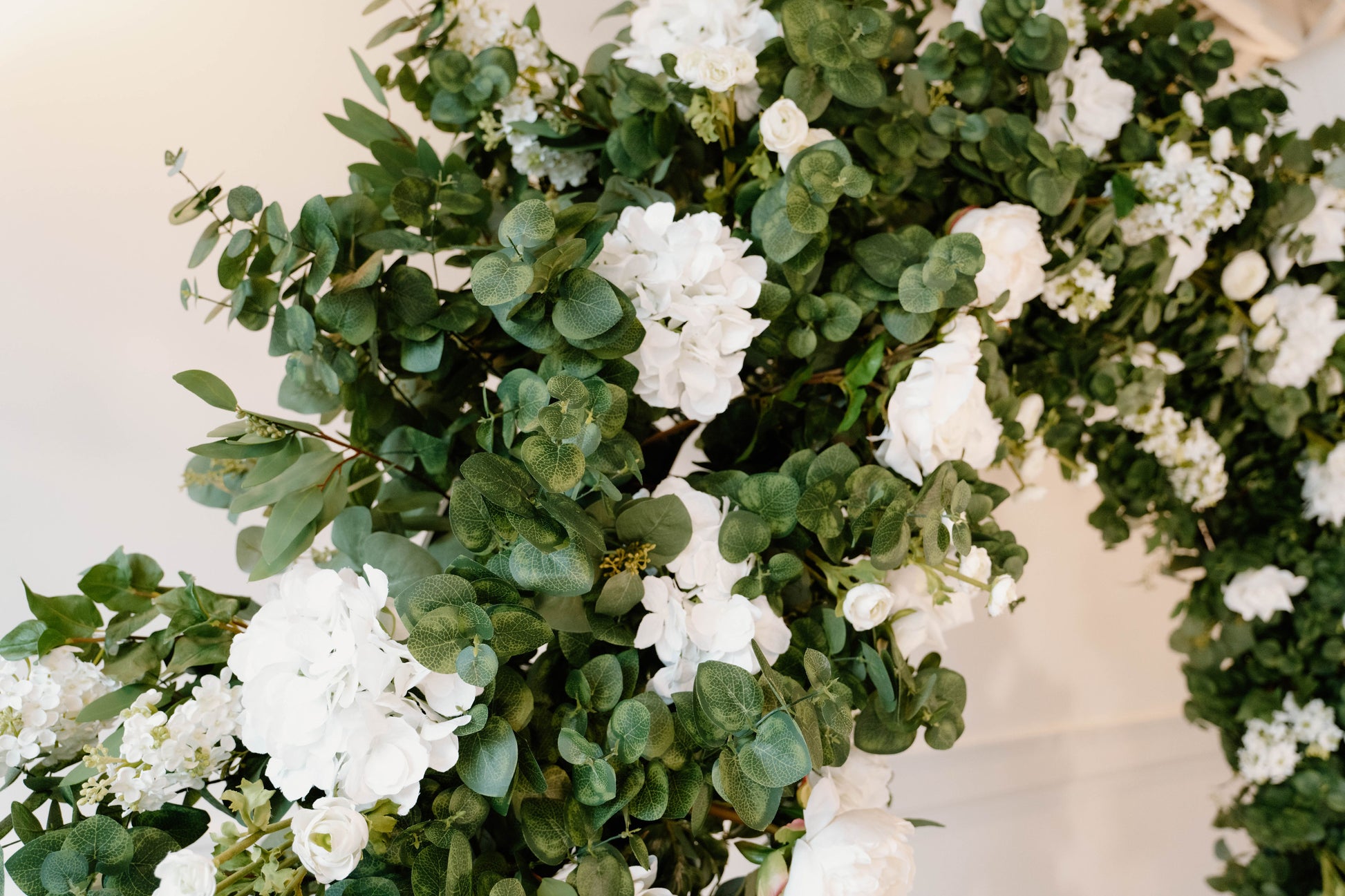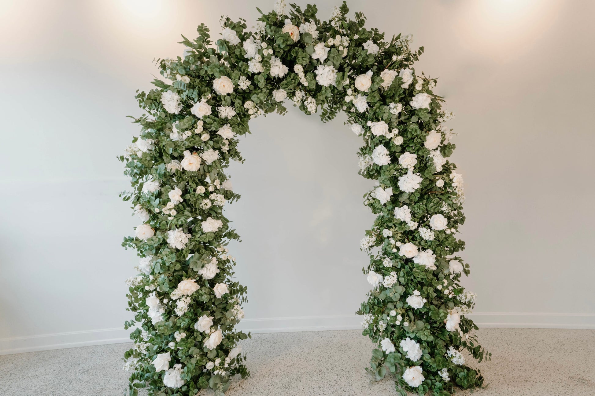 The Eden Arch was created with soft and airy garden style flower design using hydrangeas, white garden roses, white playa blanca roses, white delphinium, white ranunculus, ivory peonies, white lilac, with seeded eucalyptus, and sage spiral eucalyptus. The shape of the arch is the newest trend for weddings, although it is a very classic style that will always be in.