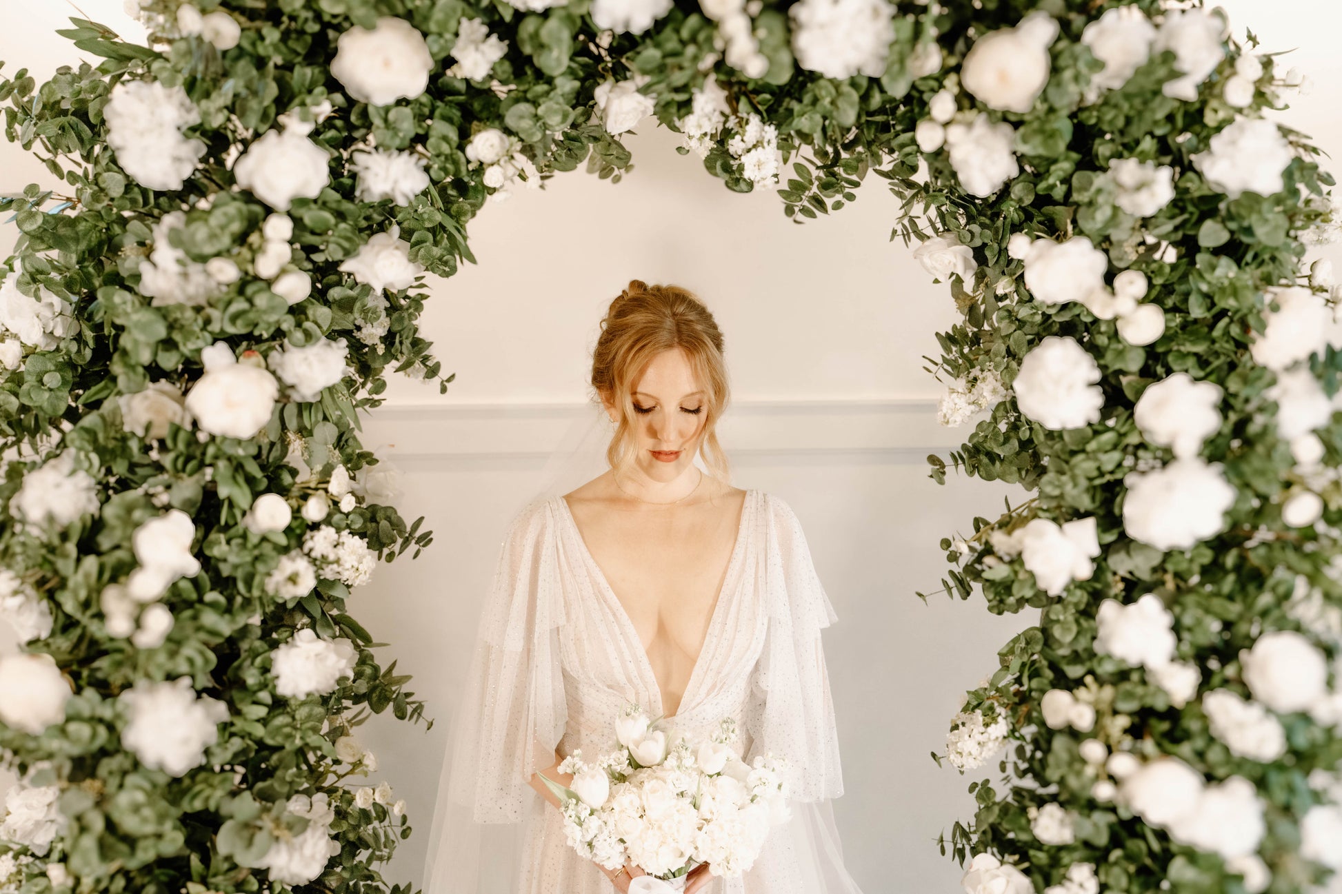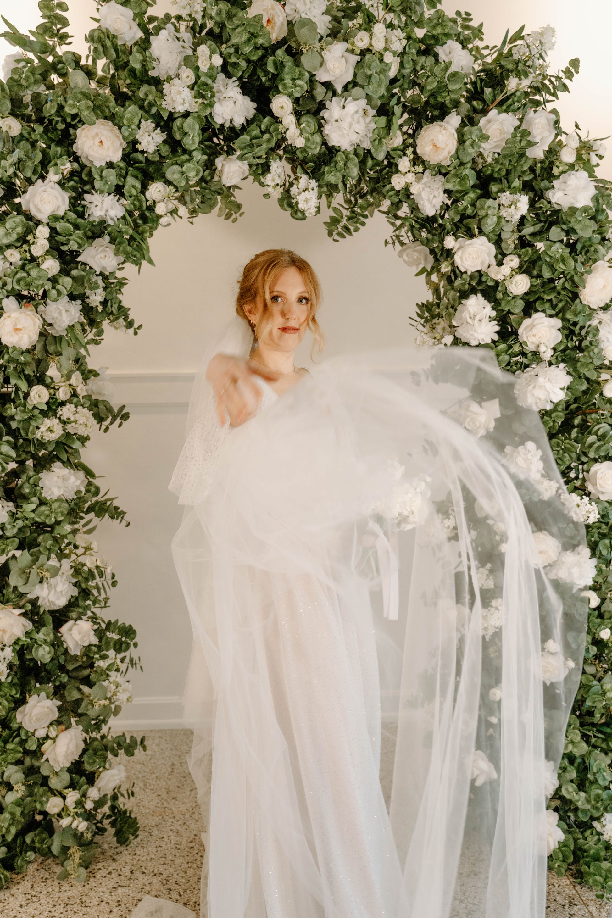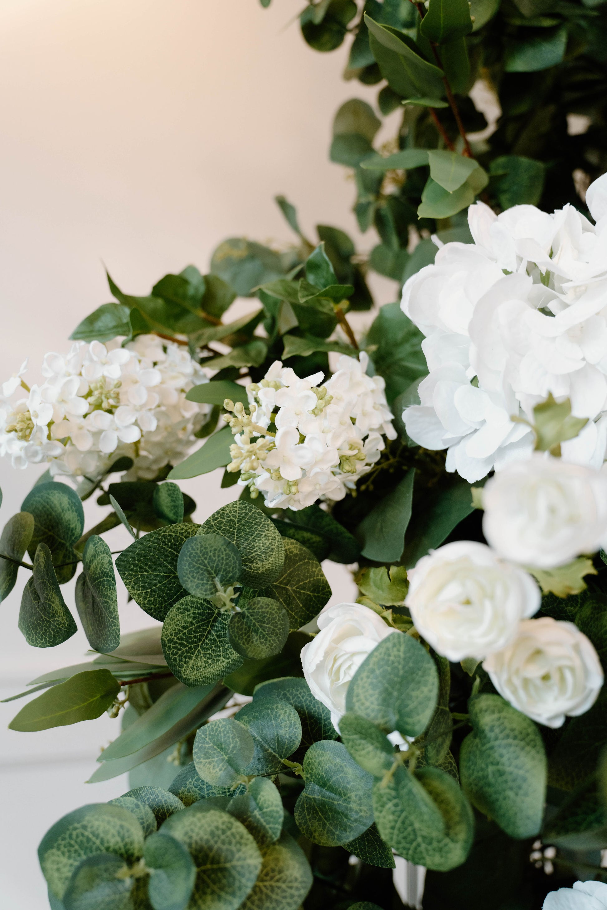 The Eden Arch was created with soft and airy garden style flower design using hydrangeas, white garden roses, white playa blanca roses, white delphinium, white ranunculus, ivory peonies, white lilac, with seeded eucalyptus, and sage spiral eucalyptus. The shape of the arch is the newest trend for weddings, although it is a very classic style that will always be in.